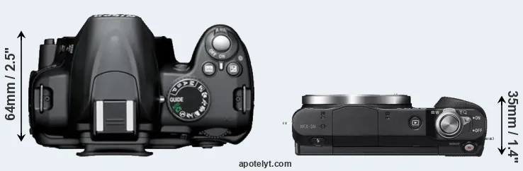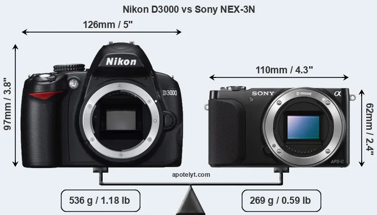 The side-by-side display below illustrates the physical size and weight of the Nikon D3000 and the Sony NEX-3N. The two cameras are presented according to their relative size. Three consecutive perspectives from the front, the top, and the back are available. All width, height and depth measures are rounded to the nearest millimeter.