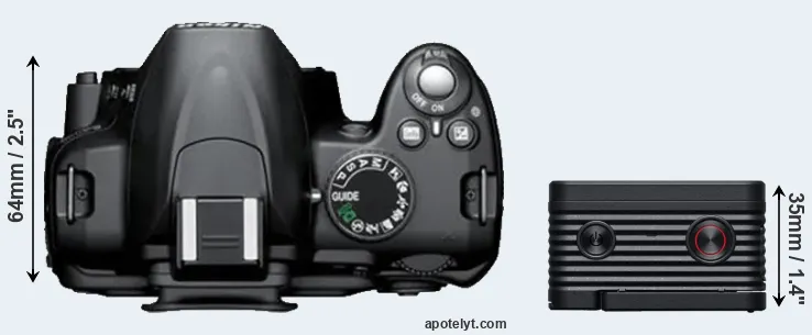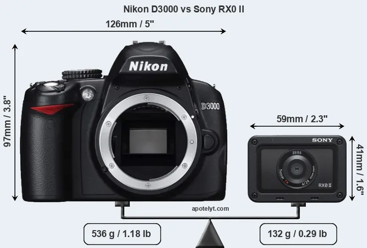 The side-by-side display below illustrates the physical size and weight of the Nikon D3000 and the Sony RX0 II. The two cameras are presented according to their relative size. Three consecutive perspectives from the front, the top, and the back are available. All width, height and depth measures are rounded to the nearest millimeter.