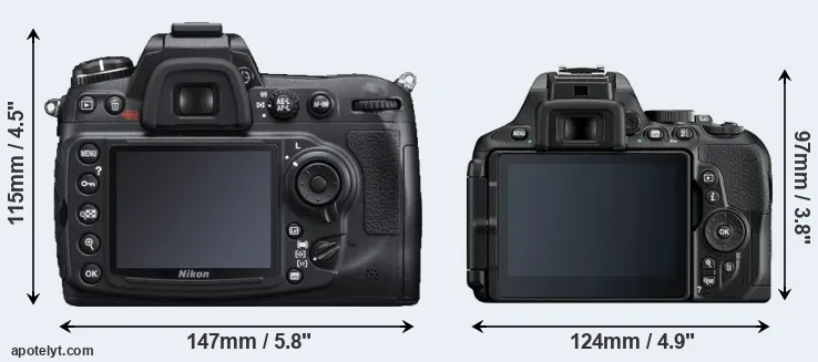 An illustration of the physical size and weight of the Nikon D300S and the Nikon D5600 is provided in the side-by-side display below. The two cameras are presented according to their relative size. Three successive views from the front, the top, and the rear are shown. All width, height and depth dimensions are rounded to the nearest millimeter.