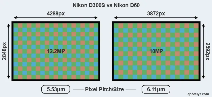 While the two cameras under review share the same sensor size, the D300S offers a higher resolution of 12.2 megapixels, compared with 10 MP of the D60. This megapixels advantage translates into a 11 percent gain in linear resolution. On the other hand, these sensor specs imply that the D300S has a higher pixel density and a smaller size of the individual pixel (with a pixel pitch of 5.53μm versus 6.11μm for the D60). In this context, it should be noted, however, that the D300S is a somewhat more recent model (by 1 year and 6 months) than the D60, and its sensor might have benefitted from technological advances during this time that at least partly compensate for the smaller pixel size.
