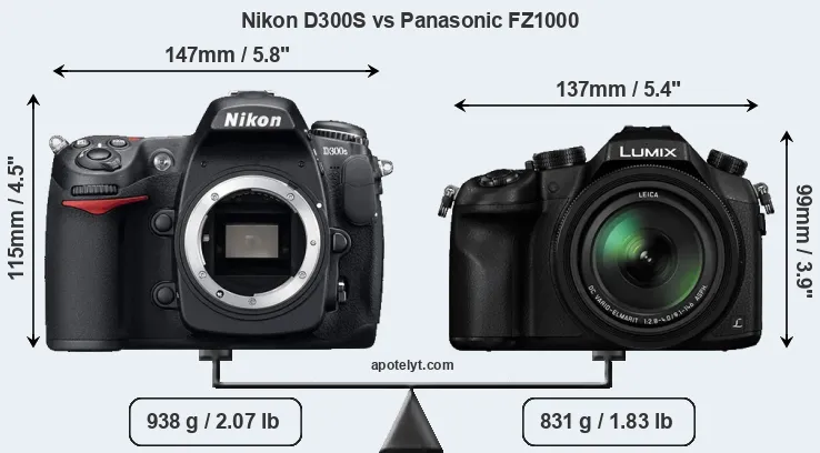 An illustration of the physical size and weight of the Nikon D300S and the Panasonic FZ1000 is provided in the side-by-side display below. The two cameras are presented according to their relative size. Three consecutive perspectives from the front, the top, and the back are available. All width, height and depth dimensions are rounded to the nearest millimeter.