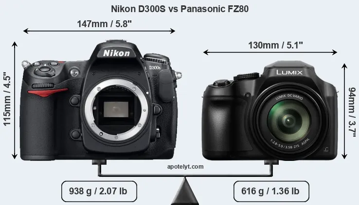 The side-by-side display below illustrates the physical size and weight of the Nikon D300S and the Panasonic FZ80. The two cameras are presented according to their relative size. Three successive views from the front, the top, and the rear are shown. All width, height and depth measures are rounded to the nearest millimeter.
