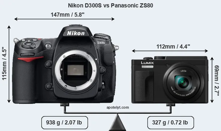An illustration of the physical size and weight of the Nikon D300S and the Panasonic ZS80 is provided in the side-by-side display below. The two cameras are presented according to their relative size. Three successive views from the front, the top, and the rear are shown. All width, height and depth dimensions are rounded to the nearest millimeter.