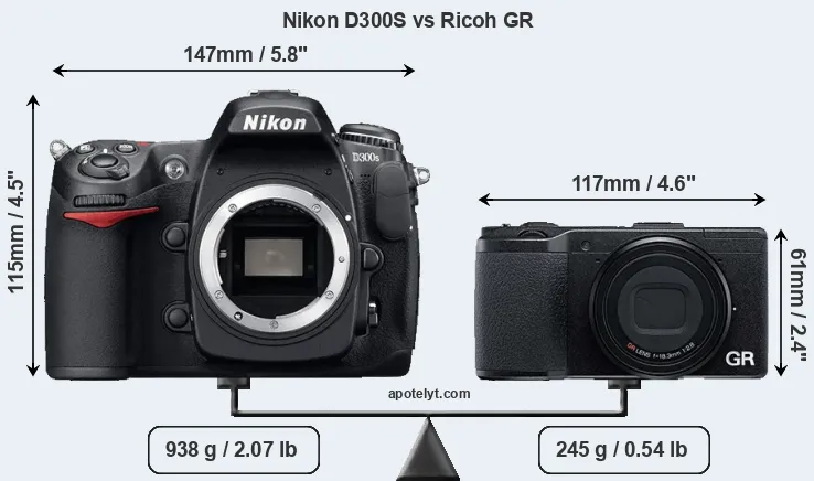 An illustration of the physical size and weight of the Nikon D300S and the Ricoh GR is provided in the side-by-side display below. The two cameras are presented according to their relative size. Three consecutive perspectives from the front, the top, and the back are available. All size dimensions are rounded to the nearest millimeter.