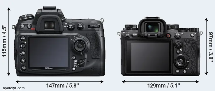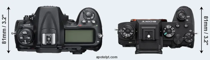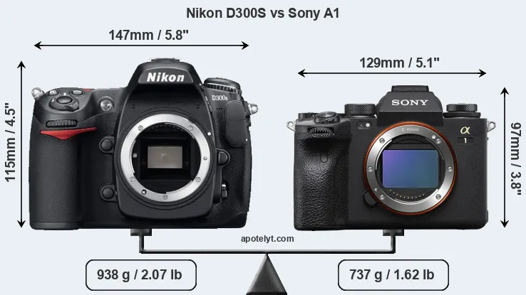 The side-by-side display below illustrates the physical size and weight of the Nikon D300S and the Sony A1. The two cameras are presented according to their relative size. Three consecutive perspectives from the front, the top, and the back are available. All width, height and depth measures are rounded to the nearest millimeter.