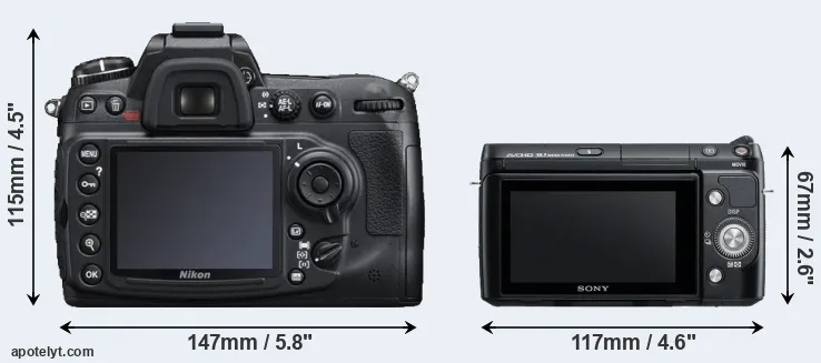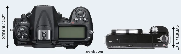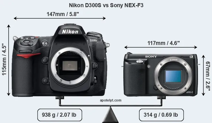 An illustration of the physical size and weight of the Nikon D300S and the Sony NEX-F3 is provided in the side-by-side display below. The two cameras are presented according to their relative size. Three successive views from the front, the top, and the rear are shown. All width, height and depth dimensions are rounded to the nearest millimeter.