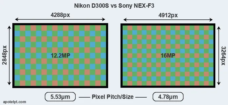 Despite having a slightly smaller sensor, the NEX-F3 offers a higher resolution of 16 megapixels, compared with 12.2 MP of the D300S. This megapixels advantage comes at the cost of a higher pixel density and a smaller size of the individual pixel (with a pixel pitch of 4.78μm versus 5.53μm for the D300S). However, it should be noted that the NEX-F3 is much more recent (by 2 years and 9 months) than the D300S, and its sensor will have benefitted from technological advances during this time that make it possible to gather light more efficiently.