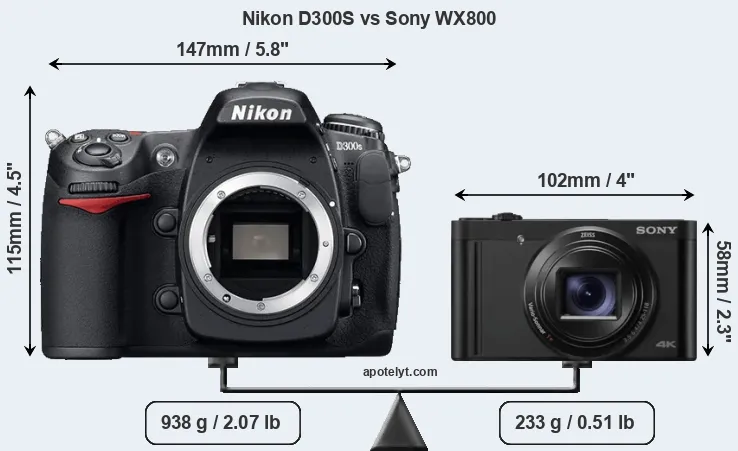 An illustration of the physical size and weight of the Nikon D300S and the Sony WX800 is provided in the side-by-side display below. The two cameras are presented according to their relative size. Three successive views from the front, the top, and the rear are shown. All size dimensions are rounded to the nearest millimeter.