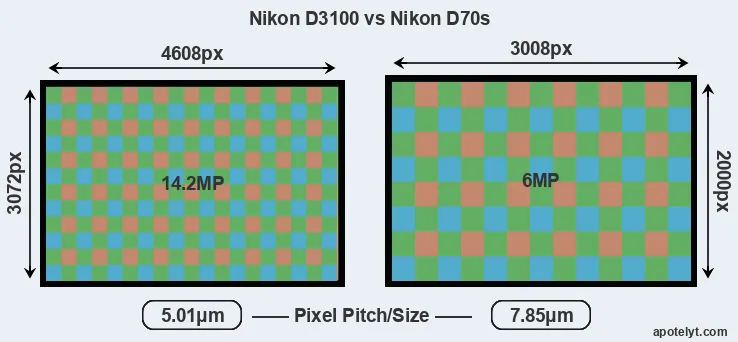 Despite having a slightly smaller sensor, the Nikon D3100 offers a higher resolution of 14.2 megapixels, compared with 6 MP of the Nikon D70s. This megapixels advantage comes at the cost of a higher pixel density and a smaller size of the individual pixel (with a pixel pitch of 5.01μm versus 7.85μm for the D70s). However, it should be noted that the D3100 is much more recent (by 5 years and 4 months) than the D70s, and its sensor will have benefitted from technological advances during this time that make it possible to gather light more efficiently.