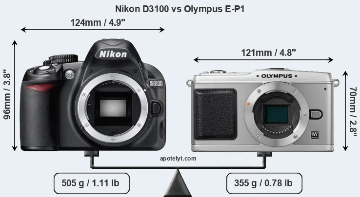 An illustration of the physical size and weight of the Nikon D3100 and the Olympus E-P1 is provided in the side-by-side display below. The two cameras are presented according to their relative size. Three consecutive views from the front, the top, and the rear side are shown. All width, height and depth dimensions are rounded to the nearest millimeter.
