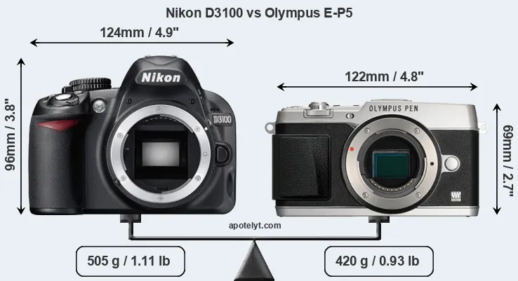 The side-by-side display below illustrates the physical size and weight of the Nikon D3100 and the Olympus E-P5. The two cameras are presented according to their relative size. Three consecutive perspectives from the front, the top, and the back are available. All width, height and depth dimensions are rounded to the nearest millimeter.