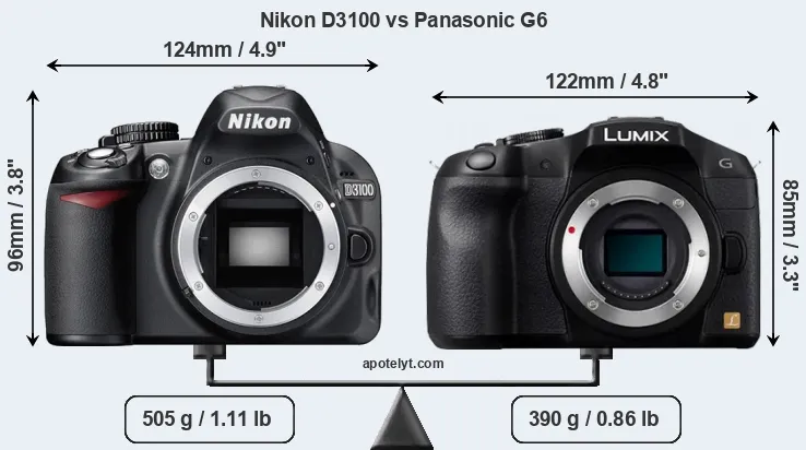 The physical size and weight of the Nikon D3100 and the Panasonic G6 are illustrated in the side-by-side display below. The two cameras are presented according to their relative size. Three successive views from the front, the top, and the rear are shown. All width, height and depth dimensions are rounded to the nearest millimeter.
