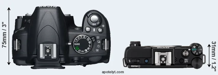 An illustration of the physical size and weight of the Nikon D3100 and the Pentax Q is provided in the side-by-side display below. The two cameras are presented according to their relative size. Three consecutive views from the front, the top, and the rear side are shown. All size dimensions are rounded to the nearest millimeter.