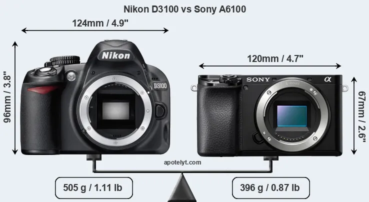 An illustration of the physical size and weight of the Nikon D3100 and the Sony A6100 is provided in the side-by-side display below. The two cameras are presented according to their relative size. Three consecutive perspectives from the front, the top, and the back are available. All width, height and depth measures are rounded to the nearest millimeter.
