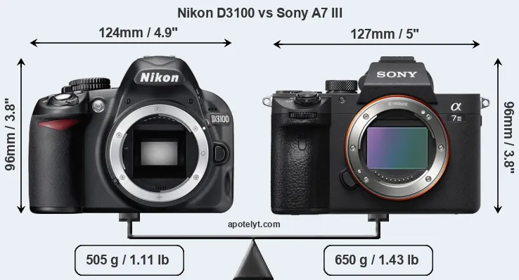 The physical size and weight of the Nikon D3100 and the Sony A7 III are illustrated in the side-by-side display below. The two cameras are presented according to their relative size. Three consecutive perspectives from the front, the top, and the back are available. All size dimensions are rounded to the nearest millimeter.
