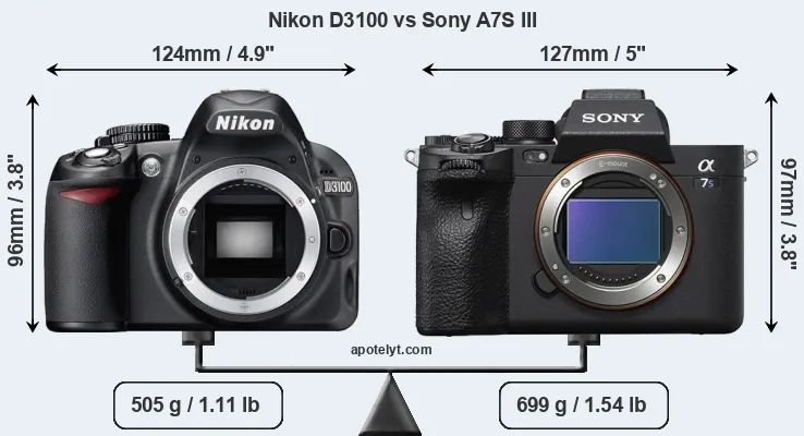 If the front view area (width x height) of the cameras is taken as an aggregate measure of their size, the Sony A7S III is somewhat larger (3 percent) than the Nikon D3100. Moreover, the A7S III is substantially heavier (38 percent) than the D3100. It is noteworthy in this context that the A7S III is splash and dust-proof, while the D3100 does not feature any corresponding weather-sealing.