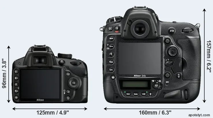 An illustration of the physical size and weight of the Nikon D3200 and the Nikon D4S is provided in the side-by-side display below. The two cameras are presented according to their relative size. Three consecutive perspectives from the front, the top, and the back are available. All width, height and depth dimensions are rounded to the nearest millimeter.
