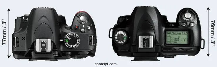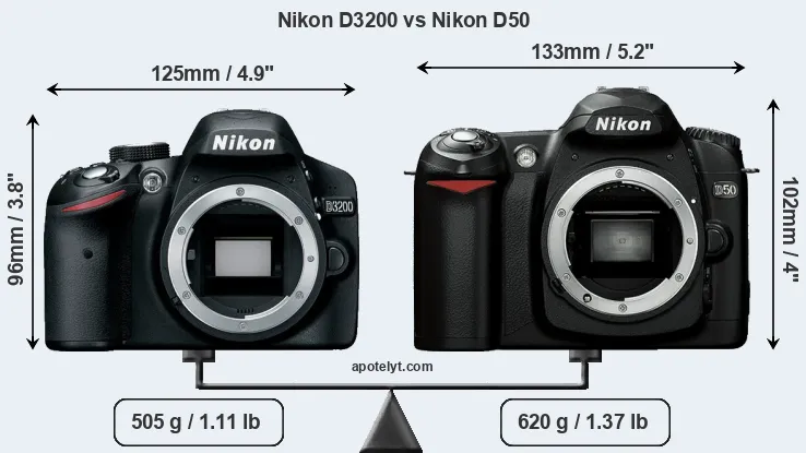 An illustration of the physical size and weight of the Nikon D3200 and the Nikon D50 is provided in the side-by-side display below. The two cameras are presented according to their relative size. Three successive views from the front, the top, and the rear are shown. All width, height and depth dimensions are rounded to the nearest millimeter.