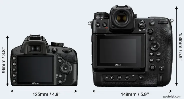 The physical size and weight of the Nikon D3200 and the Nikon Z9 are illustrated in the side-by-side display below. The two cameras are presented according to their relative size. Three successive views from the front, the top, and the rear are shown. All size dimensions are rounded to the nearest millimeter.