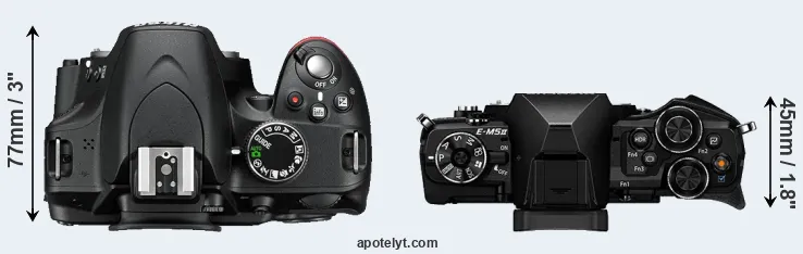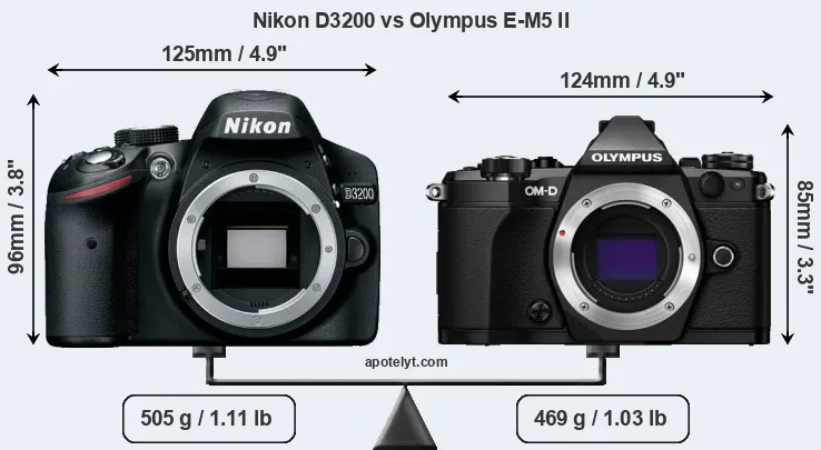 The side-by-side display below illustrates the physical size and weight of the Nikon D3200 and the Olympus E-M5 II. The two cameras are presented according to their relative size. Three consecutive perspectives from the front, the top, and the back are available. All size dimensions are rounded to the nearest millimeter.