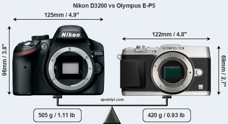 The side-by-side display below illustrates the physical size and weight of the Nikon D3200 and the Olympus E-P5. The two cameras are presented according to their relative size. Three consecutive perspectives from the front, the top, and the back are available. All size dimensions are rounded to the nearest millimeter.