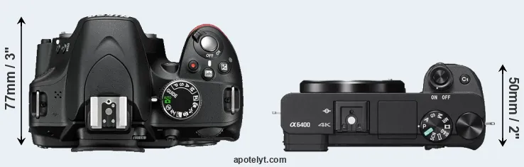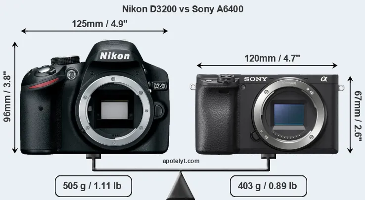 The physical size and weight of the Nikon D3200 and the Sony A6400 are illustrated in the side-by-side display below. The two cameras are presented according to their relative size. Three consecutive perspectives from the front, the top, and the back are available. All width, height and depth measures are rounded to the nearest millimeter.
