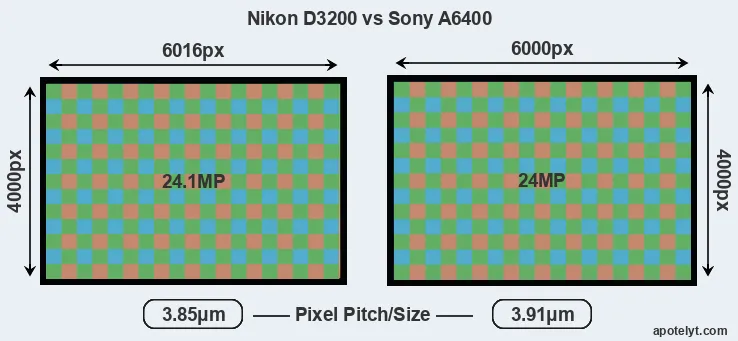 Despite having a slightly smaller sensor, the Nikon D3200 offers a higher resolution of 24.1 megapixels, compared with 24 MP of the Sony A6400. This megapixels advantage comes at the cost of a higher pixel density and a smaller size of the individual pixel (with a pixel pitch of 3.85μm versus 3.91μm for the A6400). Moreover, it should be noted that the A6400 is much more recent (by 6 years and 8 months) than the D3200, and its sensor will have benefitted from technological advances during this time that further enhance the light gathering capacity of its pixel-units.