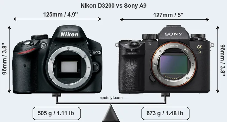 If the front view area (width x height) of the cameras is taken as an aggregate measure of their size, the Sony A9 is somewhat larger (2 percent) than the Nikon D3200. Moreover, the A9 is markedly heavier (33 percent) than the D3200. It is noteworthy in this context that the A9 is splash and dust-proof, while the D3200 does not feature any corresponding weather-sealing.