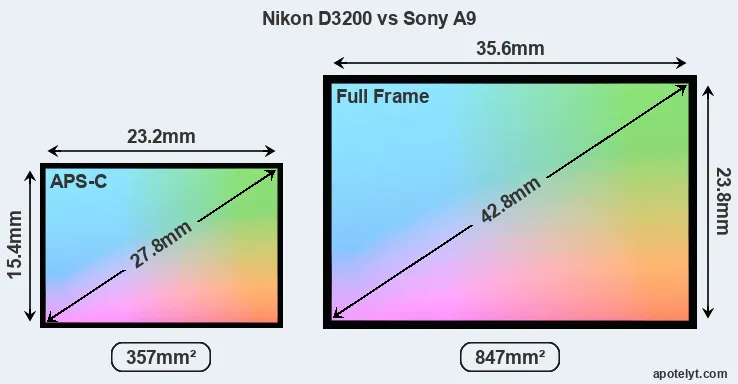 Of the two cameras under consideration, the Nikon D3200 features an APS-C sensor and the Sony A9 a full frame sensor. The sensor area in the A9 is 137 percent bigger. As a result of these sensor size differences, the cameras have a format factor of, respectively, 1.5 and 1.0. Both cameras have a native aspect ratio (sensor width to sensor height) of 3:2.