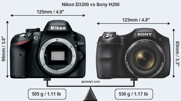 An illustration of the physical size and weight of the Nikon D3200 and the Sony H200 is provided in the side-by-side display below. The two cameras are presented according to their relative size. Three consecutive views from the front, the top, and the rear side are shown. All width, height and depth dimensions are rounded to the nearest millimeter.