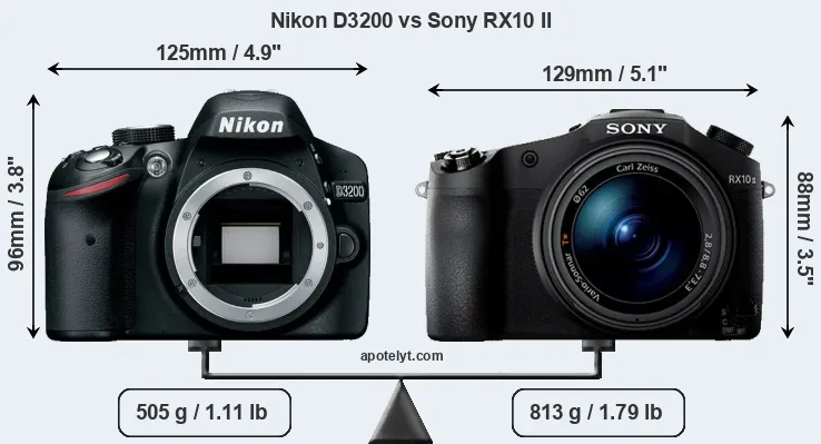 If the front view area (width x height) of the cameras is taken as an aggregate measure of their size, the Sony RX10 II is notably smaller (5 percent) than the Nikon D3200. It is noteworthy in this context that the RX10 II is splash and dust-proof, while the D3200 does not feature any corresponding weather-sealing.