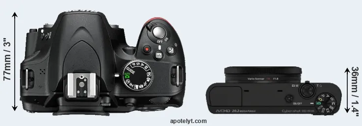 An illustration of the physical size and weight of the Nikon D3200 and the Sony RX100 is provided in the side-by-side display below. The two cameras are presented according to their relative size. Three successive views from the front, the top, and the rear are shown. All size dimensions are rounded to the nearest millimeter.