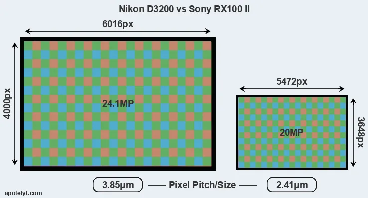 With 24.1MP, the D3200 offers a higher resolution than the RX100 II (20MP), but the D3200 nevertheless has larger individual pixels (pixel pitch of 3.85μm versus 2.41μm for the RX100 II) due to its larger sensor. However, the RX100 II is a somewhat more recent model (by 1 year and 2 months) than the D3200, and its sensor might have benefitted from technological advances during this time that enhance the light gathering capacity of its pixels.