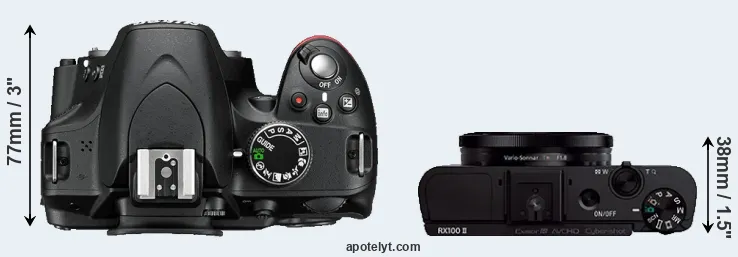 An illustration of the physical size and weight of the Nikon D3200 and the Sony RX100 II is provided in the side-by-side display below. The two cameras are presented according to their relative size. Three successive views from the front, the top, and the rear are shown. All size dimensions are rounded to the nearest millimeter.