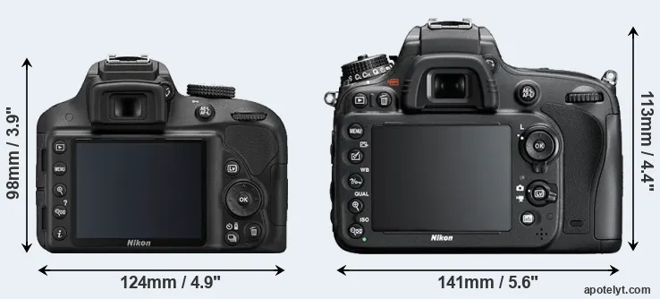 The physical size and weight of the Nikon D3300 and the Nikon D600 are illustrated in the side-by-side display below. The two cameras are presented according to their relative size. Three consecutive perspectives from the front, the top, and the back are available. All width, height and depth dimensions are rounded to the nearest millimeter.