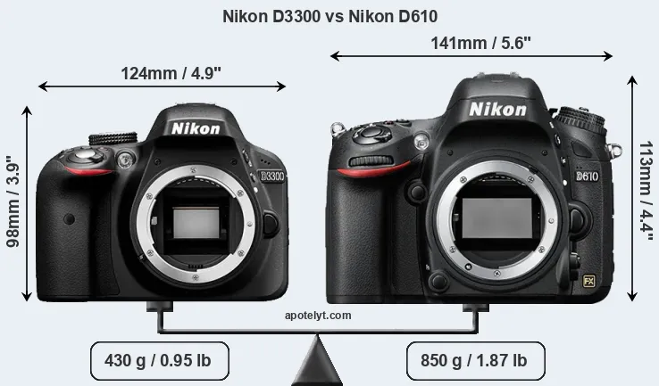 The physical size and weight of the Nikon D3300 and the Nikon D610 are illustrated in the side-by-side display below. The two cameras are presented according to their relative size. Three consecutive perspectives from the front, the top, and the back are available. All width, height and depth dimensions are rounded to the nearest millimeter.