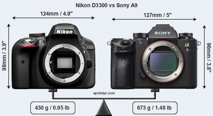 The side-by-side display below illustrates the physical size and weight of the Nikon D3300 and the Sony A9. The two cameras are presented according to their relative size. Three consecutive perspectives from the front, the top, and the back are available. All width, height and depth measures are rounded to the nearest millimeter.