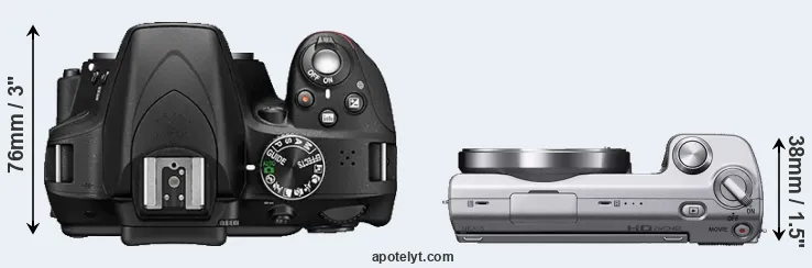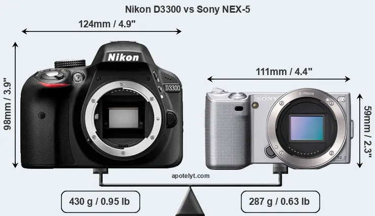 An illustration of the physical size and weight of the Nikon D3300 and the Sony NEX-5 is provided in the side-by-side display below. The two cameras are presented according to their relative size. Three successive views from the front, the top, and the rear are shown. All width, height and depth dimensions are rounded to the nearest millimeter.