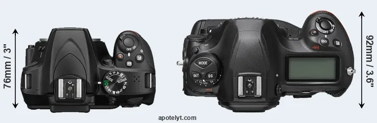The physical size and weight of the Nikon D3400 and the Nikon D6 are illustrated in the side-by-side display below. The two cameras are presented according to their relative size. Three consecutive perspectives from the front, the top, and the back are available. All width, height and depth dimensions are rounded to the nearest millimeter.