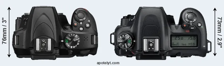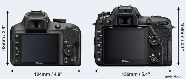 The side-by-side display below illustrates the physical size and weight of the Nikon D3400 and the Nikon D7500. The two cameras are presented according to their relative size. Three consecutive perspectives from the front, the top, and the back are available. All width, height and depth measures are rounded to the nearest millimeter.