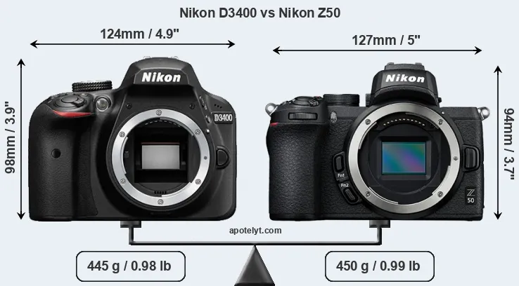 An illustration of the physical size and weight of the Nikon D3400 and the Nikon Z50 is provided in the side-by-side display below. The two cameras are presented according to their relative size. Three consecutive views from the front, the top, and the rear side are shown. All width, height and depth measures are rounded to the nearest millimeter.