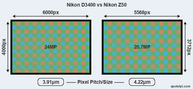 | Sensor Specs | Nikon D3400 | Nikon Z50 |