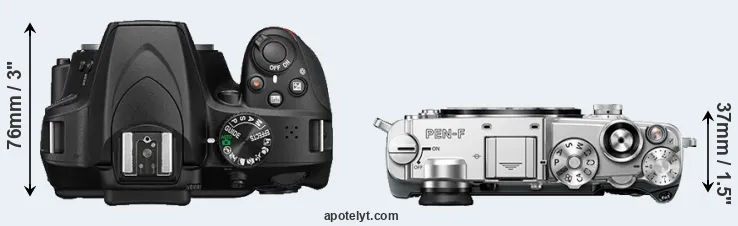 The side-by-side display below illustrates the physical size and weight of the Nikon D3400 and the Olympus PEN-F. The two cameras are presented according to their relative size. Three consecutive perspectives from the front, the top, and the back are available. All width, height and depth measures are rounded to the nearest millimeter.