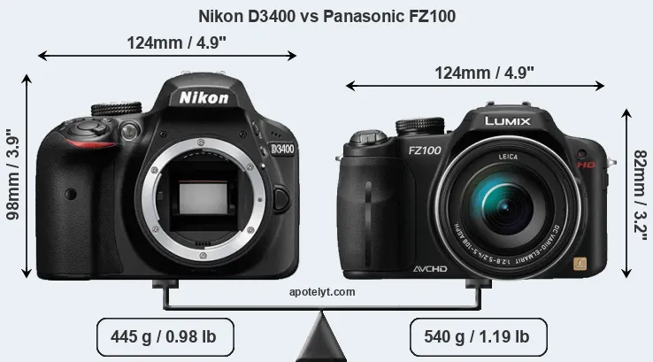 An illustration of the physical size and weight of the Nikon D3400 and the Panasonic FZ100 is provided in the side-by-side display below. The two cameras are presented according to their relative size. Three consecutive perspectives from the front, the top, and the back are available. All width, height and depth dimensions are rounded to the nearest millimeter.