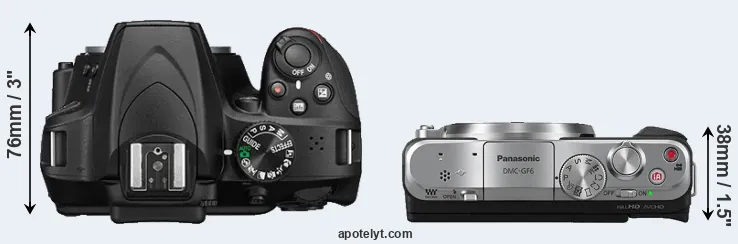 The physical size and weight of the Nikon D3400 and the Panasonic GF6 are illustrated in the side-by-side display below. The two cameras are presented according to their relative size. Three successive views from the front, the top, and the rear are shown. All width, height and depth dimensions are rounded to the nearest millimeter.