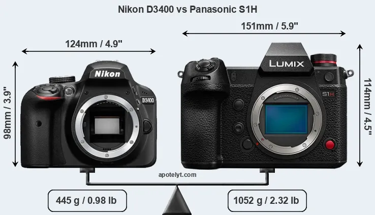 An illustration of the physical size and weight of the Nikon D3400 and the Panasonic S1H is provided in the side-by-side display below. The two cameras are presented according to their relative size. Three consecutive views from the front, the top, and the rear side are shown. All width, height and depth measures are rounded to the nearest millimeter.