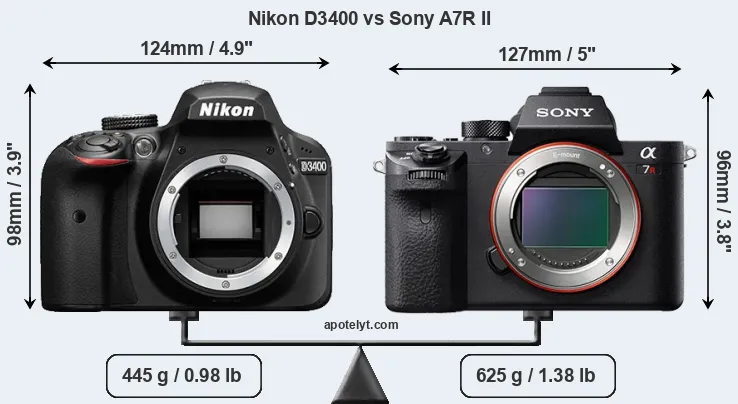 An illustration of the physical size and weight of the Nikon D3400 and the Sony A7R II is provided in the side-by-side display below. The two cameras are presented according to their relative size. Three successive views from the front, the top, and the rear are shown. All size dimensions are rounded to the nearest millimeter.