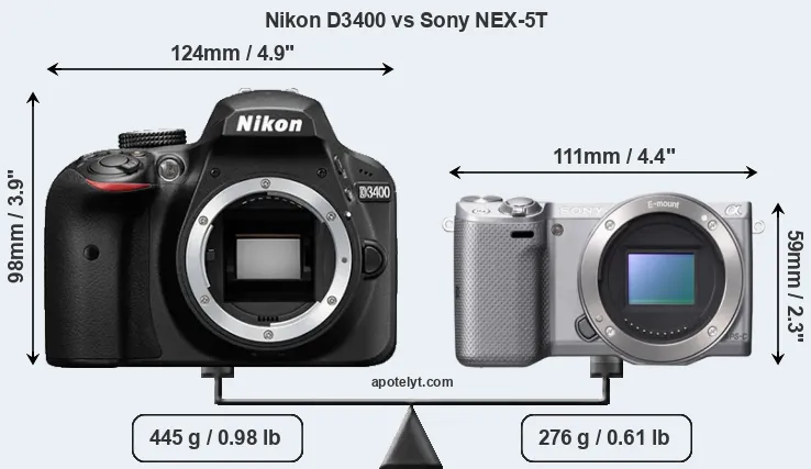 An illustration of the physical size and weight of the Nikon D3400 and the Sony NEX-5T is provided in the side-by-side display below. The two cameras are presented according to their relative size. Three successive views from the front, the top, and the rear are shown. All size dimensions are rounded to the nearest millimeter.
