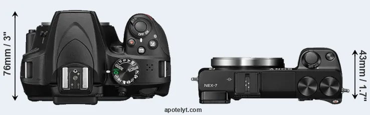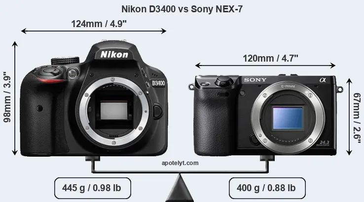 The physical size and weight of the Nikon D3400 and the Sony NEX-7 are illustrated in the side-by-side display below. The two cameras are presented according to their relative size. Three consecutive perspectives from the front, the top, and the back are available. All width, height and depth dimensions are rounded to the nearest millimeter.