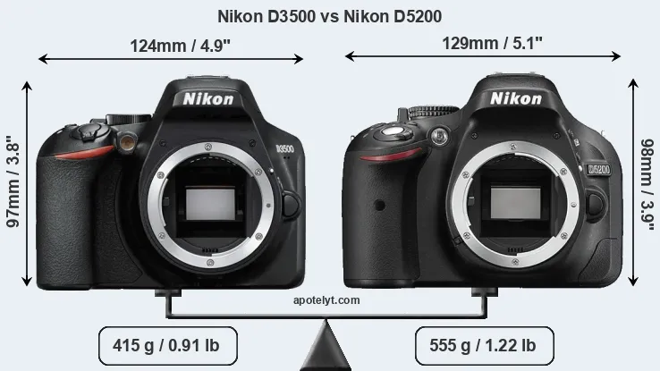 An illustration of the physical size and weight of the Nikon D3500 and the Nikon D5200 is provided in the side-by-side display below. The two cameras are presented according to their relative size. Three successive views from the front, the top, and the rear are shown. All width, height and depth dimensions are rounded to the nearest millimeter.